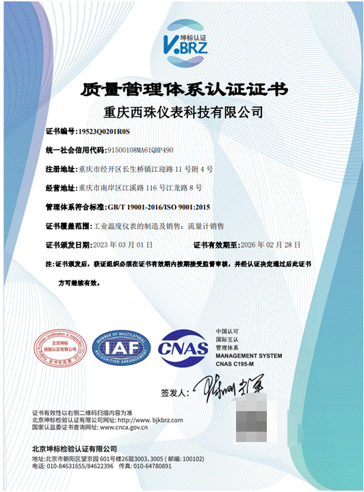 近日,重庆西珠仪表科技有限公司顺利通过:管理体系符合标准:GB/T 19001-2016/ISO 9001:2015。