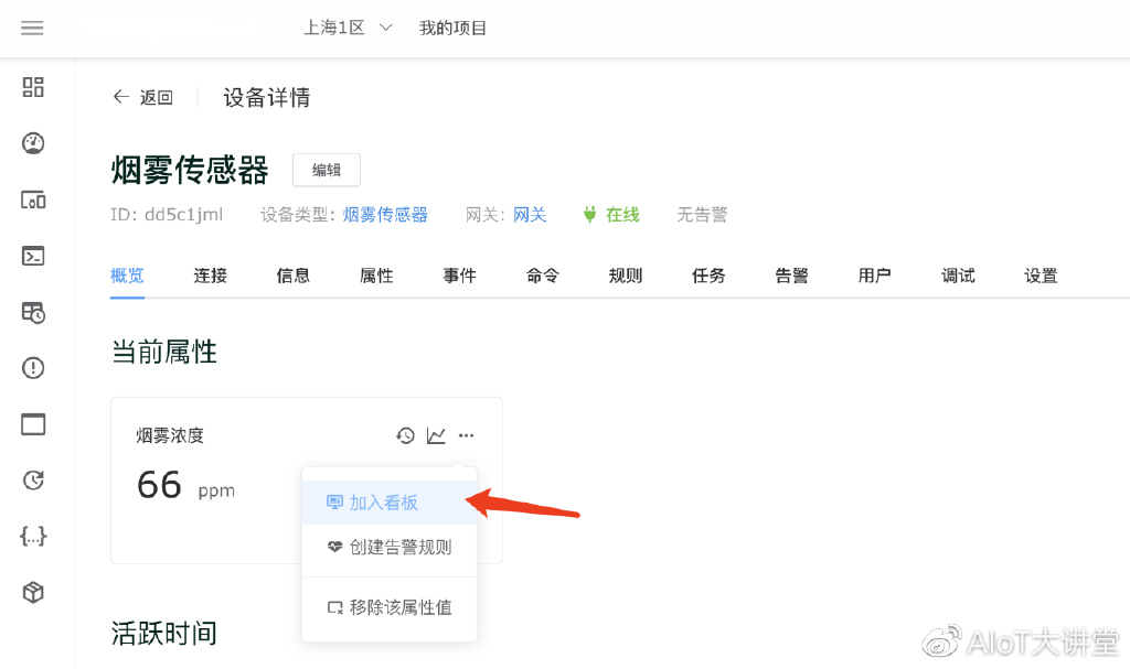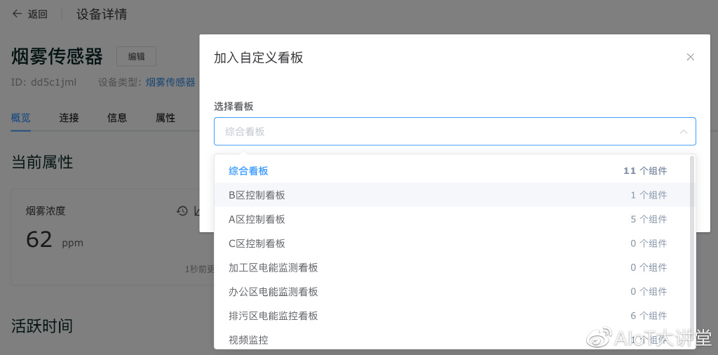 当设备上报数据后,您可以将设备属性快速添加到看板中。