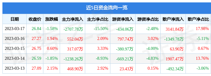 3月17日的资金流向数据方面,主力资金净流出2707.78万元,占总成交额15.5%,游资资金净流出434.06万元,占总成交额2.48%,散户资金净流入3141.84万元,占总成交额17.98%。