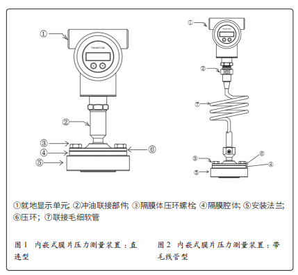 如图1、2所示为一种内嵌式膜片压力测量装置的2种类型,图1为一体式安装的仪表;图2为分体式安装的仪表,检测器安装在高处表头引出到方便读数和维护的位置。