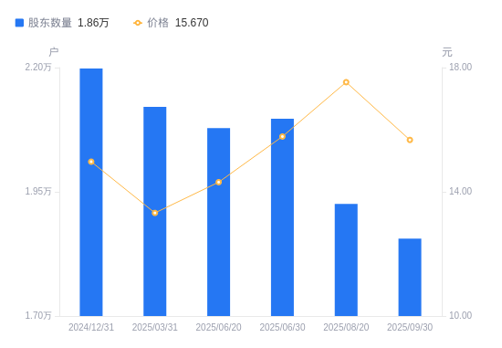 近一年(2024年9月30日至2025年9月30日),真兰仪表A股股东户数从2.65万户,减低至1.86万户,降幅29.87%,区间股价上涨39.41%。